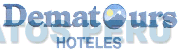 El logotipo conformado por la denominación DEMATOURS HOTELES escrita en letras características de color azul, cuya letra O contiene la figura estilizada de un cerro y un sol amarillo; conforme al modelo adjunto