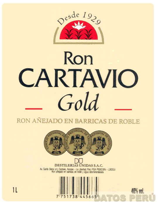 LA ETIQUETA DE COLOR CREMA QUE CONTIENE EN LA PARTE SUPERIOR CENTRAL UNA FIGURA SEMIOVAL DE COLOR ROJO CON BORDES DORADOS DENTRO DE LA CUAL APARECEN UNAS PLANTAS Y UN SOL, Y SOBRE LA MISMA APARECE LA DENOMINACION DESDE 1929, DEBAJO APARECE LA DENOMINACION RON CARTAVIO GOLD ESCRITA EN LETRAS CARACTERISTICAS Y EN COLOR NEGRO, SEGUIDA POR LA FRASE RON AÑEJADO EN BARRICAS DE ROBLE ESCRITA EN LETRAS CARACTERISTICAS EN COLOR DORADO, Y EN LA PARTE INFERIOR APARECEN TRES CIRCULOS CONTENIENDO ESCUDOS EN COLORES NEGRO Y DORADO; CONFORME AL MODELO ADJUNTO