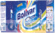 La etiqueta de fondo en color azul con la denominación DETERGENTE BOLIVAR SISTEMA BALANCEADO LAVA CON POTENTE CARIÑO escrita en letras características y la figura de un arco iris, burbujas y la figura estilizada de átomos, sobre la letra I se aprecia la figura de una estrella, a los costados leyendas y dibujos alusivos al producto, todo en los colores azul, celeste, rojo, blanco, verde, amarillo, anaranjado; conforme al modelo adjunto