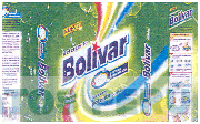La etiqueta de fondo en color verde con la denominación DETERGENTE BOLIVAR SISTEMA BALANCEADO LAVA CON POTENTE CARIÑO escrita en letras características y la figura de un arco iris, burbujas y la figura estilizada de átomos, sobre la letra I se aprecia la figura de una estrella, y a los costados leyendas y dibujos alusivos al producto, todo en los colores verde oscuro, verde claro, azul, blanco, rojo, amarillo, celeste, anaranjado; sin reivindicar la denominación DETERGENTE, la frase SISTEMA BALANCEADO y demás frases y dibujos alusivos al producto, conforme al modelo adjunto