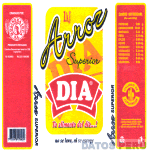 LA ETIQUETA CON LAS DENOMINACIONES DIA ARROZ SUPERIOR Y LA FRASE TU ALIMENTO DEL DIA ESCRITAS EN FORMA CARACTERISTICA Y EL DISEÑO QUE ACOMPAÑA A LA PALABRA DIA CON LOS DEMAS DISEÑOS Y DISPOSICION DE ELEMENTOS INCLUIDOS, TODO EN LA COMBINACION DE COLORES BLANCO, ROJO, AMARILLO, AMBAR Y NEGRO, CONFORME AL MODELO ADJUNTO