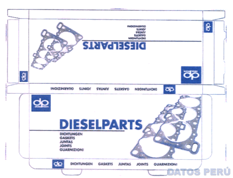 LA ENVOLTURA RECTANGULAR DE FONDO COLOR BLANCO CONTENIENDO LA DENOMINACION DIESELPARTS ESCRITA EN LETRAS CARACTERISTICAS EN COLOR AZUL CON UNA LINEA NEGRA DEBAJO Y EN LA ESQUINA SUPERIOR IZQUIERDA EL MONOGRAMA DE LAS LETRAS DP ESCRITA EN LETRAS CARACTERISTICAS EN COLOR BLANCO SOBRE FONDO AZUL, TAMBIEN SE MUESTRA LA REPRESENTACION DE DOS JUNTAS EN COLOR GRIS Y FRASES ALUSIVAS AL PRODUCTO EN COLOR NEGRO; CONFORME AL MODELO ADJUNTO