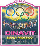 La etiqueta rectangular con fondo de color azul oscuro y amarillo y borde color fucsia, en la parte superior la frase ALIMENTO DE CAMPEONES escrita en letras características, y la frase DINA escrita en letras características, debajo la figura de cinco círculos entrelazados, al centro hay diversos personajes en actitud de hacer deporte y debajo de estos la denominación DINAVIT escrita en letras características y demás leyendas alusivas al producto, todo en la combinación de colores azul oscuro, amarillo, fucsia, azul, negro, verde, blanco y rojo; conforme al modelo adjunto.