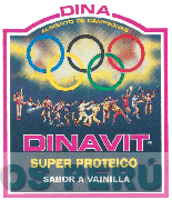 La etiqueta rectangular con fondo de color azul oscuro y amarillo y borde color fucsia, en la parte superior la frase ALIMENTO DE CAMPEONES escrita en letras características, y la frase DINA escrita en letras características, debajo la figura de cinco círculos entrelazados, al centro hay diversos personajes en actitud de hacer deporte y debajo de estos la denominación DINAVIT escrita en letras características y demás leyendas alusivas al producto, todo en la combinación de colores azul oscuro, amarillo, fucsia, azul, negro, verde, blanco y rojo; conforme al modelo adjunto.