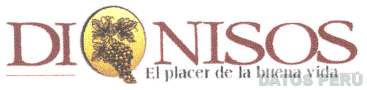 La denominación DIONISOS escrita en letras características apreciándose las dos primeras letras y la última subrayadas, la primera letra O de la denominación está representada por una esfera conteniendo un racimo de uvas, debajo la frase EL PLACER DE LA BUENA VIDA, todo en los colores guinda, dorado, rojo, amarillo, negro y anaranjado, conforme al modelo adjunto
