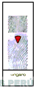 Una etiqueta representativa de una botella trasada en línea ondeada en cuyo centro aparece en rojo y borde dorado la palabra DIVA todo sobre una cadena de oro debajo de la cual va la palabra ungaro conforme al modelo