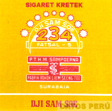 LA ETIQUETA RECTANGULAR DIVIDIDA EN DOS TRAMOS POR UNA LINEA HORIZONTAL UBICADA EN LA PARTE INFERIOR DE LA MISMA, CONTENIENDO EN SU PARTE SUPERIOR LA FIGURA DE NUEVE ESTRELLAS QUE CORONAN LA DENOMINACION DJI SAM SOE Y 234 ESCRITA EN LETRAS CARACTERISTICAS, Y EN SU PARTE INFERIOR LA DENOMINACION DJI SAM SOE ESCRITAS EN LETRAS CARACTERISTICAS, TODO EN LOS COLORES AMARILLO, ROJO Y BLANCO, CONFORME AL MODELO ADJUNTO