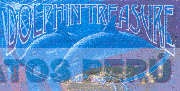 La denominación DOLPHIN TREASURE escrita en letras características, dentro de una figura rectangular que a la vez contiene la representación estilizada de dos delfines dentro de una figura ovalada, un cofre conteniendo joyas, algas, peces y burbujas, todo en la combinación de colores celeste, azul, morado, fucsia, amarillo, marrón, negro, verde y blanco; conforme al modelo adjunto