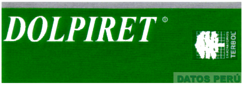 EL LOGOTIPO RECTANGULAR COLOR VERDE OSCURO (343 - C PANTONE) CON UNA FRANJA DE COLOR PLATEADO (877 - C PANTONE) EN LA PARTE SUPERIOR, CONFORMADO POR LA DENOMINACION DOLPIRET ESCRITA EN LETRAS CARACTERISTICAS Y LA FIGURA DE UN ARBOL DEBAJO DEL CUAL SE APRECIA LA DENOMINACION LABORATORIOS TERBOL EN COLOR BLANCO, CONFORME AL MODELO,