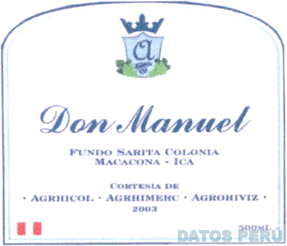 La denominación DON MANUEL escrita en letras características y la figura de una corona y letra A característica dentro de un escudo, en cuya parte inferior se aprecian figuras irregulares e indicaciones alusivas al producto, todo en letras características, en colores azul, blanco, verde, rojo y celeste; conforme al modelo adjunto