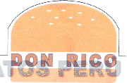 El logotipo conformado por un pan tipo hamburguesa color naranja cortado, como relleno se lee DON RICO en letras mayúsculas de color rojo con bordes negros en la parte superior del pan se ven 9 puntitos blancos, las letras rojas sobre fondo blanco, sin reivindicar reborde negro superior