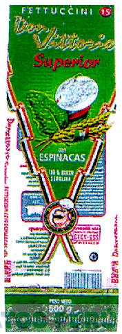 LA ETIQUETA CONTENIENDO LA DENOMINACION DON VITTORIO SUPERIOR EN LA PARTE SUPERIOR, Y DIVIDIDA EN DOS CAMPOS POR DOS CINTAS ONDULADAS QUE EN EL CENTRO SE UNEN Y FORMAN UNA FIGURA CIRCULAR QUE EN SU INTERIOR CONTIENE LA FIGURA ESTILIZADA DE LA CABEZA DE UN COCINERO CON BIGOTES Y GORRO, ASIMISMO EN LA PARTE SUPERIOR SE APRECIAN LA FIGURA DE UNA HOJA DE ESPINACA Y DOS ESPIGAS; EN LA PARTE INFERIOR DE LA ETIQUETA SE APRECIAN LEYENDAS ALUSIVAS AL PRODUCTO; TODO EN LA COMBINACION DE COLORES, VERDE, ROJO, DORADO, BLANCO Y AMARILLO, CONFORME AL MODELO ADJUNTO,