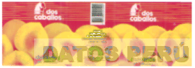 UNA ETIQUETA RECTANGULAR EN CUYA PARTE SUPERIOR HAY DOS SILUETAS DE CABEZA DE CABALLO, SEMISUPERPUESTAS, Y LA EXPRESION DOS CABALLOS; Y EN LA PARTE INFERIOR A TODO LO LARGO DE LA ETIQUETA, HAY FIGURAS DE DURAZNOS ENTEROS Y EN MITADES,DE COLOR AMARILLO, TODO ESTO EN LOS COLORES BLANCO, ROJO, AMARILLO Y VERDE, CO