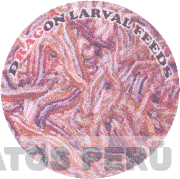 La etiqueta de forma circular conteniendo figuras de larvas y al contorno se aprecia la denominación DRAGON LARVAL FEEDS escrita en letras características, todo en los colores marrón en dos tonalidades, morado en dos tonalidades, gris, crema, rojo y negro; conforme al modelo adjunto