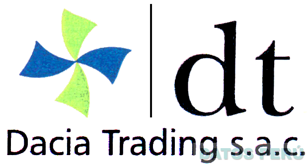 La representación de una hélice de cuatro vértices unidas en las puntas, en los colores azul claro y verde claro, al lado derecho se aprecian las letras DT estilizadas y una línea, en la parte inferior la denominación DACIA TRADING S.A.C. escrita en letras características en color negro; conforme al modelo adjunto