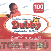 El logotipo conformado por la denominación DUBBY escrita en letras características, la figura caricaturizada de un sol sobre las letras B e Y escrita en forma característica todo dentro de una figura oval, al lado izquierdo y encima la imagen de un bebe, en el lado inferior la frase ENGRIE A TU BEBE, seguido de los términos RESISTENTES, SUAVES, AGRADABLE AROMA y CON EXTRACTO DE AVENA, en los colores rojo, blanco, amarillo, celeste, anaranjado, azul y crema; conforme al modelo adjunto