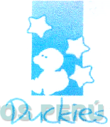 El logotipo conformado por la denominación DUCKIES escrita en letras características y sobre ella la representación caricaturizada de un pato y tres estrellas en un fondo rectangular, todo en los colores blanco y celeste; conforme al modelo adjunto