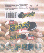 La etiqueta conformada por la denominación DULCE DIA COCO RELLENAS... DE CREMA! escrita en letras características y la figura de varios cocos superpuestos en la parte inferior de la etiqueta y cuatro galletas rellenas, la parte superior presenta líneas horizontales que van de color marrón oscuro al inicio atenuándose éste en la parte central y volviendo a subir el tono al final de la línea, todo en la combinación de colores marrón claro, marrón oscuro, blanco, rojo, azul y amarillo; conforme al modelo adjunto