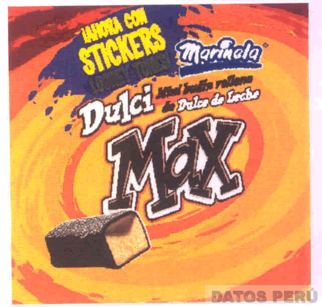 LA ETIQUETA CONFORMADA POR LA DENOMINACION DULCI MAX ESCRITA EN LETRAS CARACTERISTICAS, LA DENOMINACION MARINELA ESCRITA EN LETRAS CARACTERISTICAS, LA FIGURA DE UN BIZCOCHO Y DEMAS LEYENDAS ALUSIVAS AL PRODUCTO, TODO EN LOS COLORES BLANCO, NEGRO, ROJO, AZUL, AMARILLO, MARRON OSCURO Y ANARANJADO; CONFORME AL MODELO ADJUNTO
