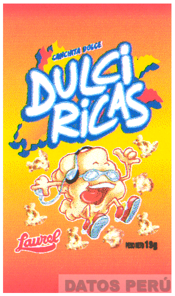 EL LOGOTIPO CONFORMADO POR LA DENOMINACIÓN DULCI RICAS LAUREL, ESCRITA EN LETRAS CARACTERÍSTICAS; ACOMPAÑADA DE LA FIGURA ESTILIZADA EN FORMA DE CANCHITA, EN LOS COLORES ROJO, ANARANJADO, AMARILLO, AZUL, NEGRO Y BLANCO; CONFORME AL MODELO ADJUNTO
