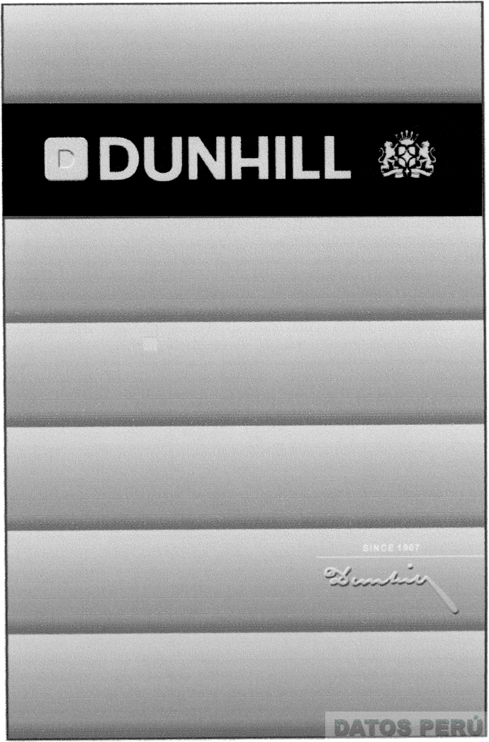 La etiqueta rectangular dividida en siete franjas horizontales paralelas, donde la segunda franja está conformada por la denominación DUNHILL escrita en letras características, antecedida por una figura cuadrangular que contiene la letra D escrita de forma característica y seguida de la silueta estilizada de dos leones parados sobre la representación estilizada de una cinta y en medio de los cuales se aprecia la figura estilizada de un escudo; asimismo, en la sexta franja se aprecia la denominación SINCE 1907 DUNHILL escrita en letras características y una línea recta horizontal sobre la palabra DUNHILL, todo en la combinación de colores gris en diversas tonalidades y negro; conforme al modelo adjunto