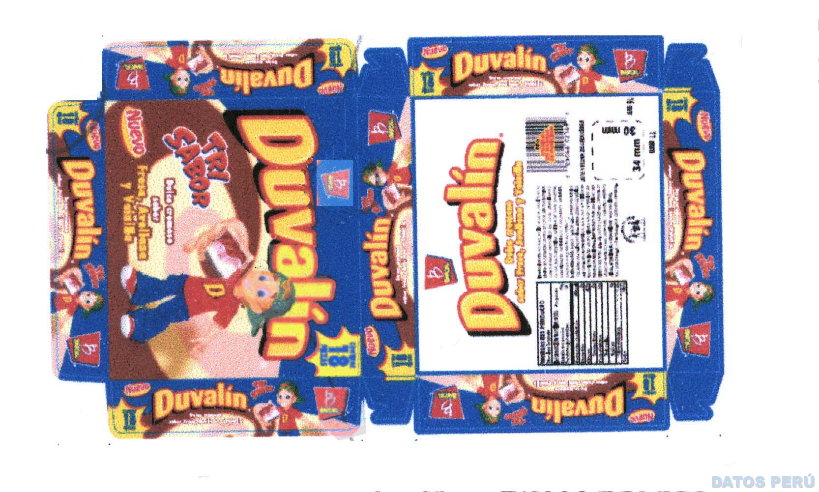 El empaque conformado por la denominación DUVALÍN TRI SABOR escrita en letras características que aparece en forma repetida, la representación caricaturizada de un niño con gorra sosteniendo un dulce, la denominación NUEVO escrita en letras características y dentro de una figura ovalada (sin reivindicar la figura), la letra B escrita en forma característica y dentro de una figura geométrica (sin reivindicar la figura) y demás elementos informativos del producto sin reivindicar, todo en un fondo en espiral y en la combinación de colores azul, amarillo en diversas tonalidades, beige, marrón, rosado, rojo, verde, blanco, negro y anaranjado; conforme al modelo adjunto
