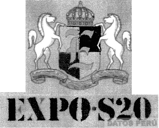La denominación EXPO y S20 separadas por un punto en el centro, en la parte superior la representación de un escudo conteniendo la letra E apreciándose sobre el escudo una corona y a los lados la figura de dos caballos parados sobre sus patas traseras y en la parte inferior un diseño que se asemeja a la figura de una cinta, sin reivindicar colores; conforme al modelo adjunto
