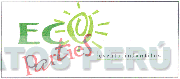 El logotipo conformado por la denominación ECO PARTIES escrita en letras características donde la letra O se encuentra representada por la figura estilizada de un sol, al lado derecho se aprecia la denominación EVENTOS INFANTILES escrita en letras características al interior de una figura rectangular, todo en los colores verde claro (pantone process 298), verde oscuro (pantone process 284), rojo pastel (pantone process 73) y negro (pantone process negro, 60% trama); conforme al modelo adjunto