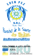 El logotipo conformado por la representación de un timón rodeado de dos delfines y la denominación EDEN PEZ S.R.L. PAITA - PERÚ, debajo se aprecia la denominación PARAISO DE LA SUERTE DE PAITA LA SUERTE EN RIFAS escrita en letras características, todo en los colores azul, celeste y amarillo; conforme al modelo adjunto