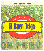 El logotipo conformado por la denominación EL BUEN TRIGO escrita en letras características; dentro de una cinta y dos figuras ovoidales superpuestas; acompañada de una franja en la parte superior que contiene frases alusivas al producto (sin revindicar) y la figura estilizada de un campo con sembrío de trigo y maíz; todo en los colores amarillo, azul, negro, verde en distintas tonalidades, beige y anaranjado; conforme al modelo adjunto