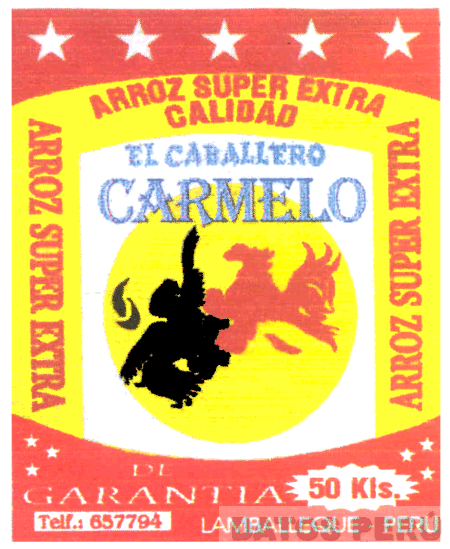 EL LOGOTIPO CONFORMADO POR LA DENOMINACION EL CABALLERO CARMELO; EN LA PARTE SUPERIOR LA FIGURA DE CINCO ESTRELLAS, EN LA PARTE CENTRAL LA REPRESENTACION DE DOS GALLOS EN LIDIA, EN LOS COLORES BLANCO, ROJO, NEGRO, AZUL Y AMARILLO; CONFORME AL MODELO ADJUNTO