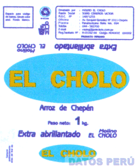 EL EMPAQUE CONTENIENDO EN LA PARTE CENTRAL UNA FIGURA OVALADA DE COLOR CELESTE, CONTENIENDO LA DENOMINACION EL CHOLO ESCRITA EN LETRAS CARACTERISTICAS DE COLOR DORADO, DEBAJO SE APRECIAN LAS DENOMINACIONES ARROZ DE CHEPEN, EXTRA ABRILLANTADO, MOLINO EL CHOLO ESCRITAS EN LETRAS DE COLOR AZUL; CONFORME AL MODELO ADJUNTO