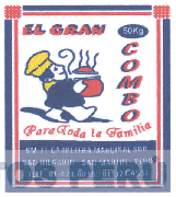La etiqueta de bordes de color azul y rojo con la denominación EL GRAN COMBO escrita en letras características de color rojo con sombra azul, al centro la figura estilizada de un hombre de traje azul y gorra amarilla que se encuentra cargando una olla humeante de color rojo; debajo la denominación PARA TODA LA FAMILIA escrita en letras características de color rojo; conforme al modelo adjunto