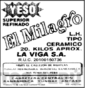 La etiqueta rectangular conteniendo las denominaciones EL MILAGRO y LA VIGA S.A. escrita en letras características y la palabra YESO escrita en letras características dentro de una figura con borde en zigzag, en la parte superior e inferior de la etiqueta se observan frases alusivas al producto; conforme al modelo adjunto