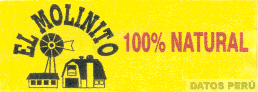 EL LOGOTIPO CONFORMADO POR LA DENOMINACION EL MOLINITO ESCRITO EN LETRAS CARACTERISTICAS, SOBRE LA REPRESENTACION DE UN MOLINO DE AIRE CON DOS VIVIENDAS RURALES; ASIMISMO SE APRECIA LA DENOMINACION 100% NATURAL, TODO EN LOS COLORES AMARILLO, NEGRO Y ROJO, CONFORME AL MODELO ADJUNTO