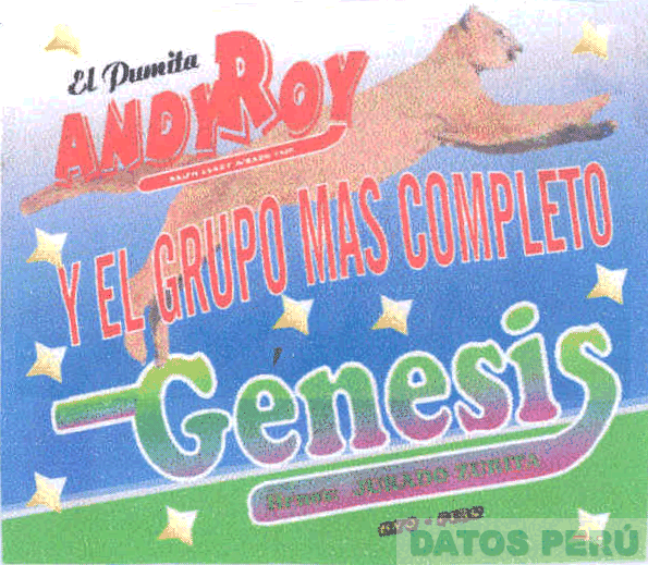 La denominación EL PUMITA ANDYROY y debajo la frase Y EL GRUPO MÁS COMPLETO, ambas escritas en letras características, sobre la representación estilizada de un puma y diversas estrellas; asimismo, debajo la denominación GENESIS escrita en letras características; todo en los colores negro, beige, rojo, amarillo, verde en diversas tonalidades, violeta, celeste y blanco; conforme al modelo adjunto