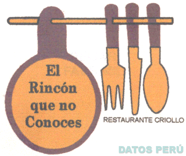 El logotipo conformado por la denominación EL RINCÓN QUE NO CONOCES RESTAURANTE CRIOLLO escrita en letras características dentro de la representación de una olla de barro estilizada, la cual es atravesada en el asa por un palo y al mismo tiempo éste atraviesa a un tenedor, cuchillo y cuchara, todo en la combinación de colores marrón y mostaza oscuro; conforme al modelo adjunto