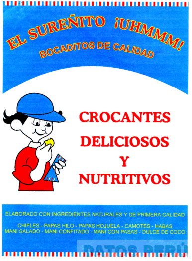 EL LOGOTIPO CONFORMADO POR LA DENOMINACION EL SUREÑITO ¡UHMMM!, ESCRITA EN LETRAS CARACTERISTICAS ROJAS CON BORDE AMARILLO Y LA FIGURA DE UN NIÑO, CON GORRO DE COLOR CELESTE, CHAQUETA ROJA, COMIENDO PAPITAS DE UNA BOLSA COLOR CELESTE, CONFORME AL MODELO ADJUNTO,