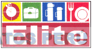 LA DENOMINACIÓN ELITE ESCRITA EN LETRAS CARACTERÍSTICAS, EN LA PARTE SUPERIOR SE APRECIA LA REPRESENTACIÓN ESTILIZADA DE UN RELOJ, UNA LONCHERA, DOS TERMOS, UN TENEDOR Y UN PLATO, TODO EN LOS COLORES ROJO, BLANCO, AMARILLO, VERDE Y AZUL; CONFORME AL MODELO ADJUNTO