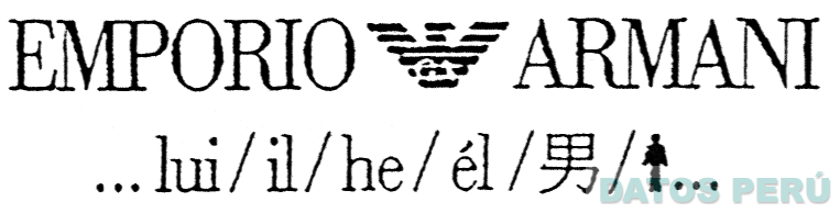 EL LOGOTIPO CONFORMADO POR LA DENOMINACION EMPORIO ARMANI ESCRITA EN LETRAS CARACTERISTICAS, Y LA FIGURA ESTILIZADA DE UN AGUILA ENTRE AMBAS PALABRAS, TODO SOBRE LAS PALABRAS LUI,IL,HE,EL ESCRITAS EN LETRAS CARACTERISTICAS, UNA PALABRA EN JAPONES Y LA SILUETA ESTILIZADA DE UN HOMBRE, TODOS SEPARADOS POR SIGNOS OBLICUOS Y TRES PUNTOS AL INICIO Y AL FINAL, CONFORME AL MODELO ADJUNTO