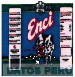 La etiqueta con la denominación ENCI y sus letras características de colores rojo y blanco. En la parte superior una franja verde con una flor estilizada y en su interior el rostro de una vaca sonriente, y las palabras leche pura sin reivindicar el color blanco. En la parte inferior la figura de un niño sonríen