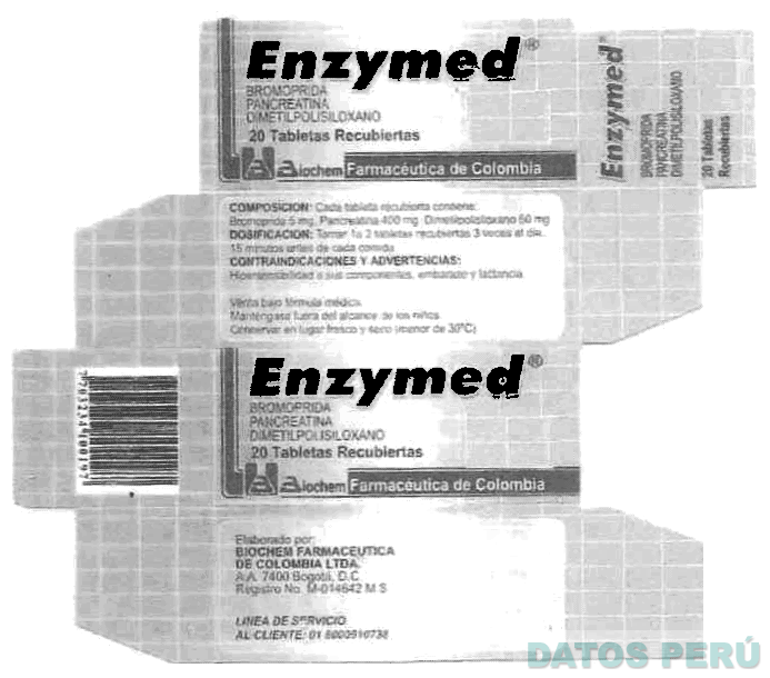 La caja-empaque conteniendo la denominación ENZYMED BIOCHEM escrita en letras características y la letra B estilizada, sin reivindicar colores ni la denominación FARMACEUTICA DE COLOMBIA; conforme al modelo adjunto