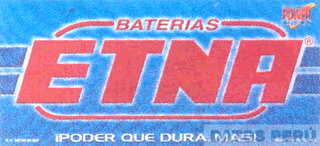 LA DENOMINACION ETNA ESCRITA EN FORMA CARACTERISTICA, SOBREPUESTA A UNA FIGURA RECTANGULAR CON ANGULOS CURVOS, DEBAJO SE APRECIA LA FRASE ¡PODER QUE DURA MAS!, EN LA ESQUINA DERECHA SUPERIOR SE APRECIA LA PALABRA POWER, EN LOS COLORES ROJO, CELESTE, AZULINO, BLANCO Y AMARILLO; CONFORME AL MODELO ADJUNTO