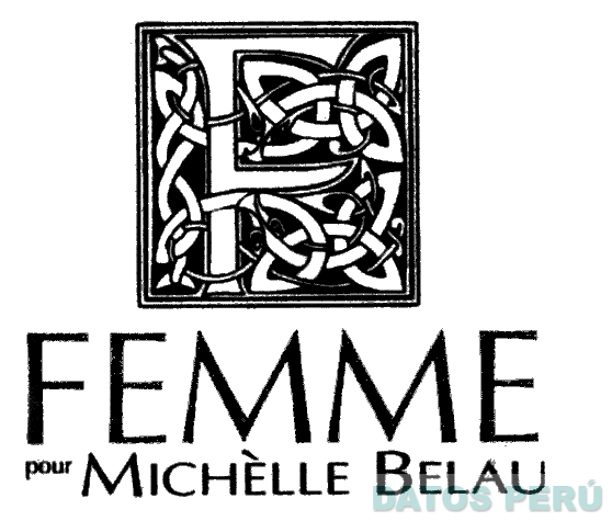 El logotipo de forma cuadrada en cuyo interior se aprecia la letra F entrelazada con una serie de figuras irregulares; en la parte inferior se aprecia la denominación FEMME POUR MICHELLE BELAU escrita en forma característica, donde la primera letra E del término MICHELLE lleva un acento en forma contraria; sin reivindicar colores; conforme al modelo adjunto