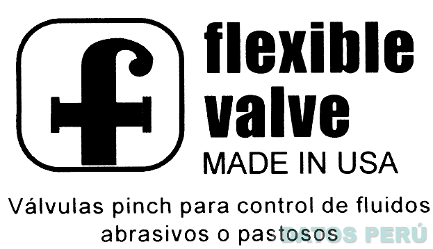 El logotipo conformado por la denominación FLEXIBLE VALVE MADE IN USA escrita en letras características, acompañada de una letra F estilizada dentro de una figura irregular y de las frases VÁLVULA PINCH PARA CONTROL DE FLUIDOS ABRASIVOS O PASTOSOS (sin reivindicar); conforme al modelo adjunto
