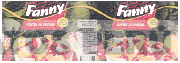 La etiqueta rectangular conteniendo la denominación FANNY escrita en letras blancas en fondo rojo bermellón, una línea ondulante de extremo a extremo en color amarillo y dos recipientes conteniendo figuras alusivas al producto (frutas) en la combinación de colores rojo, verde oscuro, anaranjado, blanco; conforme al modelo adjunto