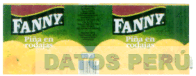 LA ETIQUETA RECTANGULAR Y DENOMINACIONES FANNY DE FONDO VERDE EN DEGRADACION HASTA PARTE MEDIA E INFERIOR AMARILLO Y COMBINACION DE COLORES MARRON, AMARILLO, NEGRO, BLANCO Y SEIS RODAJAS DE PIÑA, SEGUN FACSIMIL ADJUNTO,