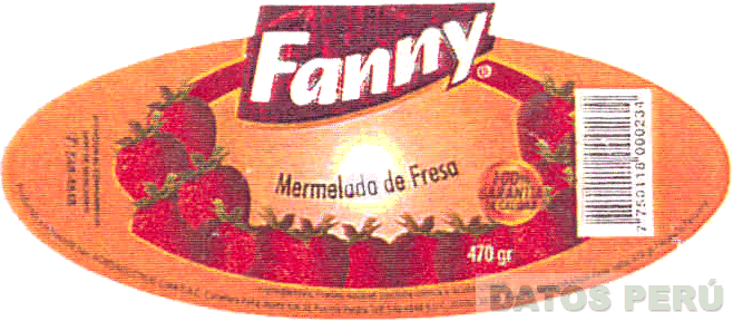El logotipo conformado por la denominación FANNY escrita en letras estilizadas dentro de una figura irregular ubicada sobre una figura oval que contiene la representación estilizada de fresas, en la combinación de colores rojo bermellón, blanco, anaranjado, negro, verde; conforme al modelo adjunto