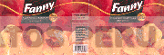 La etiqueta rectangular que contiene la denominación FANNY escrita en letras características en color blanco, en un fondo rojo y línea ondulante de extremo a extremo y figuras alusivas al producto en la parte inferior y demás leyendas alusivas al producto, en la combinación de colores rojo, amarillo, negro, anaranjado; conforme al modelo adjunto
