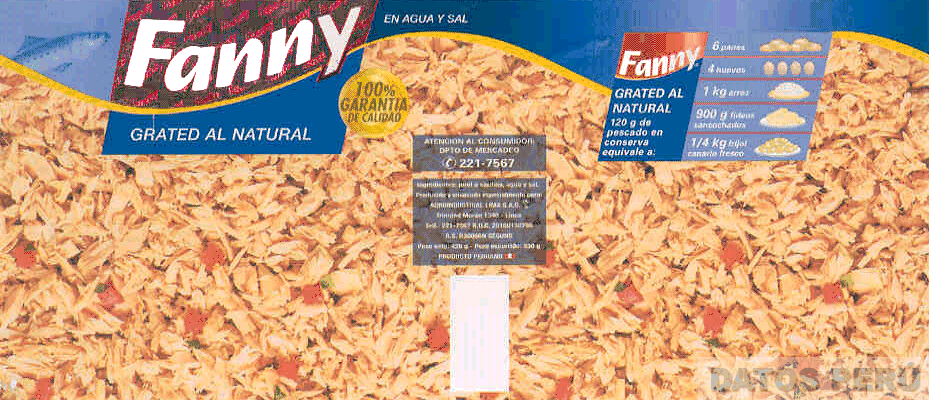 La etiqueta rectangular en cuyo lado izquierdo se aprecia la denominación FANNY escrita en letras características y al lado derecho la equivalencia nutricional, el fondo está conformado por la representación estilizada de trozos de pescado y tomate, todo en los colores rojo berbellón, rojo, blanco, beige, azul, azul claro, verde y amarillo; conforme al modelo adjunto